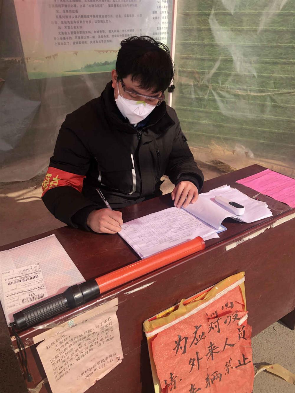 根據(jù)居委會(huì)安排,柴楠每天在社區(qū)出入口進(jìn)行詢問登記、測(cè)量體溫、疫情宣傳、人員排查等工作。2020年的第一場(chǎng)春雨給疫情防控工作帶來(lái)了更大的難題,他身披雨衣,在刺骨的寒風(fēng)和冰冷的細(xì)雨中一絲不茍的測(cè)體溫、查驗(yàn)身份證、做好信息登記…一忙就是整整一天。