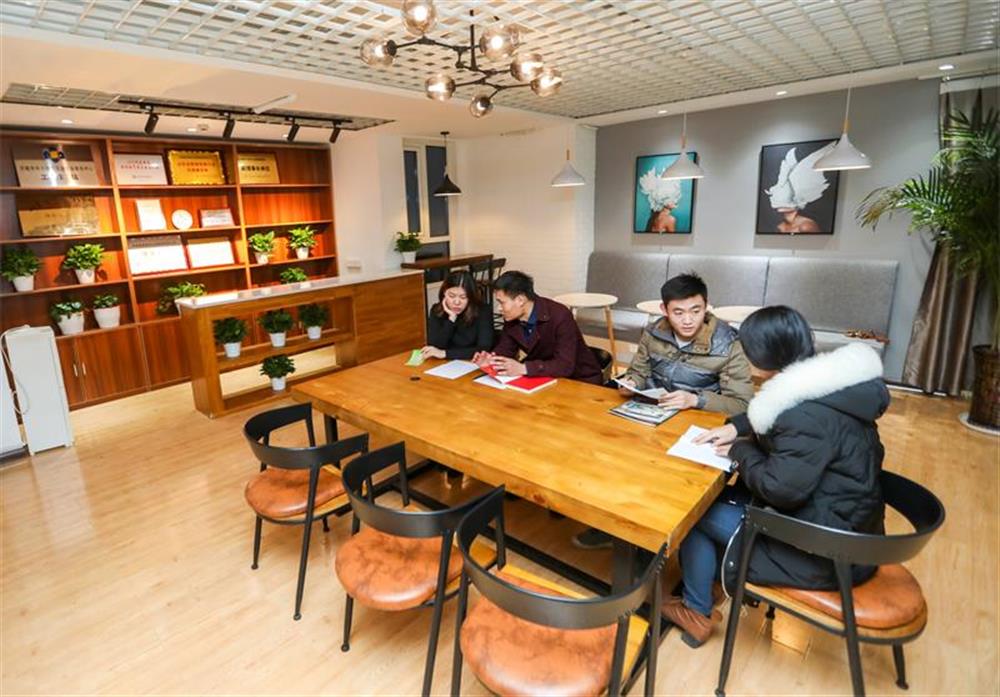 在4樓眾創(chuàng)空間,聚集著50多家在孵跨境電商企業(yè),多數(shù)都是90后創(chuàng)業(yè)人員。25日臨近傍晚6點(diǎn),不少創(chuàng)客仍埋頭忙碌。在眾創(chuàng)空間打造的咖啡吧,幾個(gè)年輕人正探討業(yè)務(wù)。